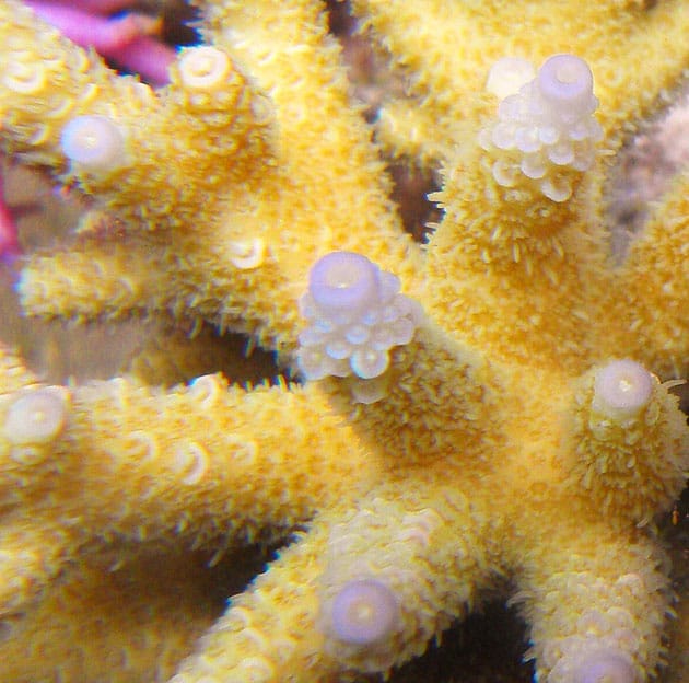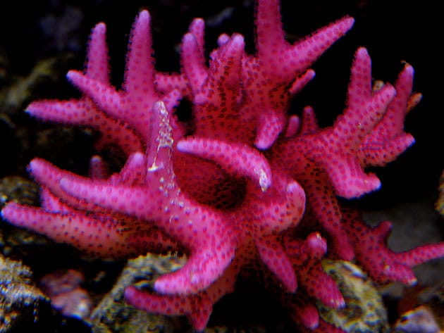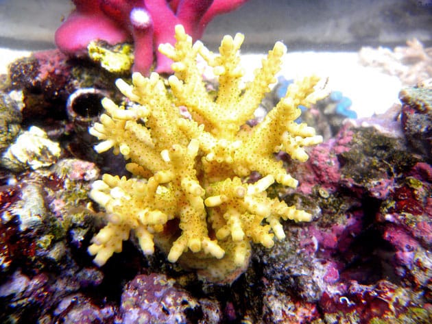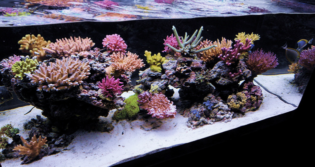 Come è già stato detto in precedenza gli animali presenti in vasca sono quasi esclusivamente coralli duri. Sono presenti: Acropora millepora, loisette, valida, humilis, plana, echinata e altre acropore di cui onestamente non conosco il nome; Stylophora pistillata, Milka, subseriata, Seriatopora, hystrix guttatus e una r.o.t Pocillopora damicornis gialla . Oltre agli SPS in vasca sono presenti due Euphyllie ed una coppia di tridacne, spugne e per finire anche due Acanturidi, un Naso elegans ed un leucosternon.