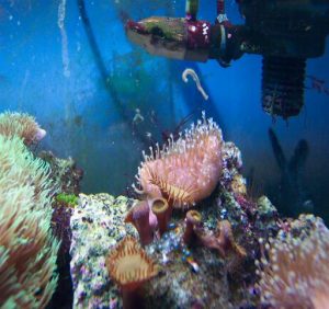 Ecco il filtro in funzione nella vasca. Notare il flusso di acqua che esce e come con un semplice elastico è possibile fissarlo alla vasca. Sistema pratico e che permette un rapido cambio delle resine al suo interno.