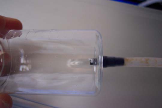 La costruzione del filtro porta resine-carboni è semplicissima, al beverone si deve togliere la parte metallica con le sfere che sta sul fondo. Si fa passare il tubicino e con l’ ausilio di un fornello a gas e un bastoncino in legno cilindrico si va a stringere, in modo che non ci siano perdite di acqua dall ‘uscita (la parte destra della foto, si vede il tubo verde infilato al posto di quello metallico presente al momento dell ‘acquisto del distributore di acqua e si vedono anche i segni della fiamma usata per unire saldamente le due parti). Infilando il bastoncino e scaldando la plastica sul fornello si riesce con facilità’ ad adattare il beverone al tubo e impedire perdite di acqua e senza perdere la forma.