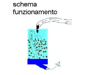 Ecco il filtro in funzione nella vasca. Notare il flusso di acqua che esce e come con un semplice elastico è possibile fissarlo alla vasca. Sistema pratico e che permette un rapido cambio delle resine al suo interno.