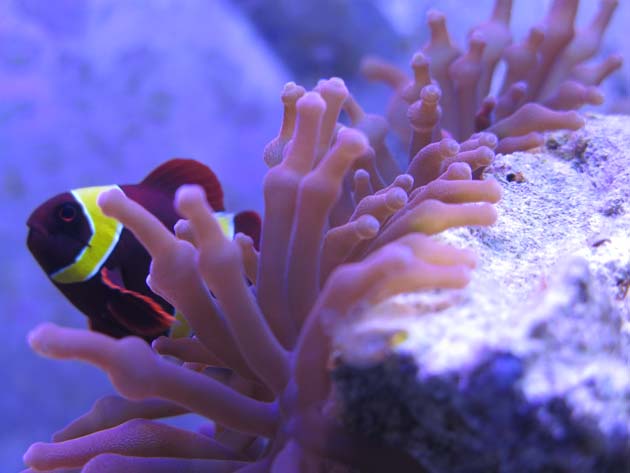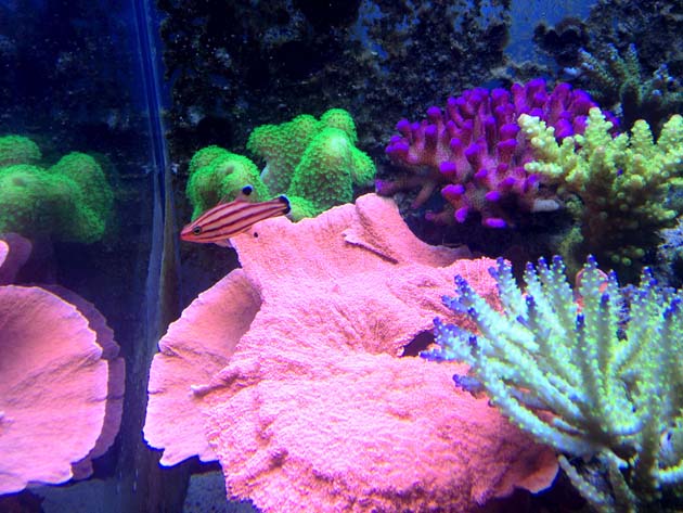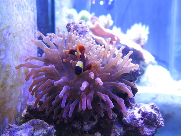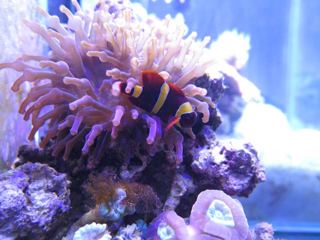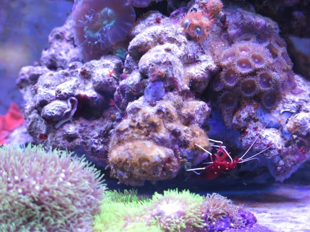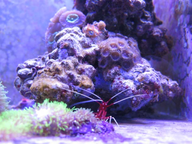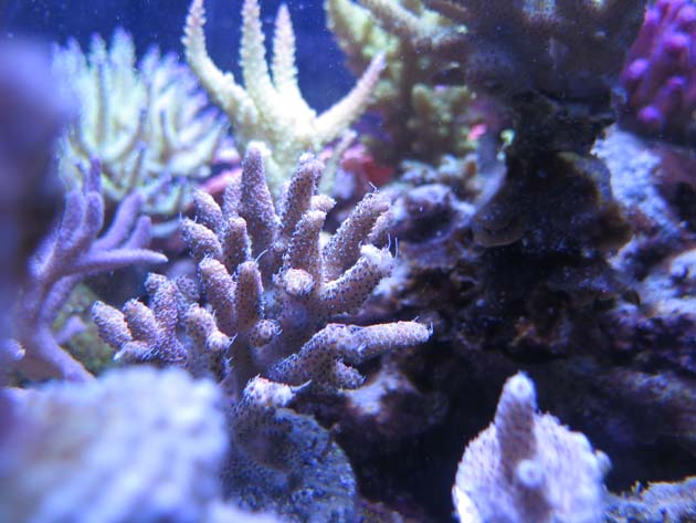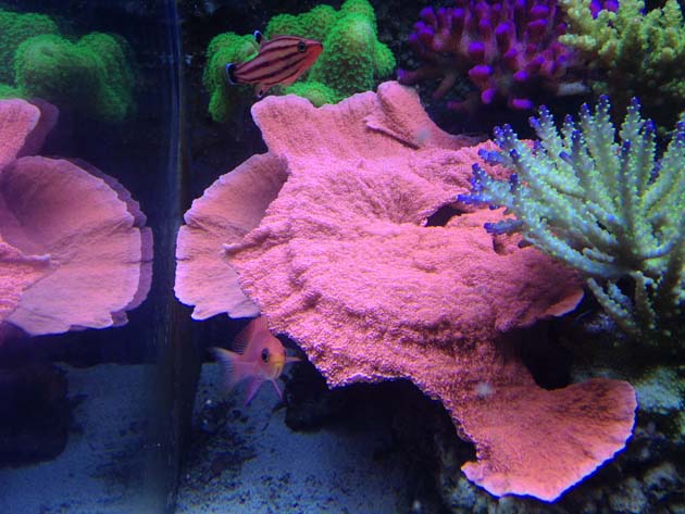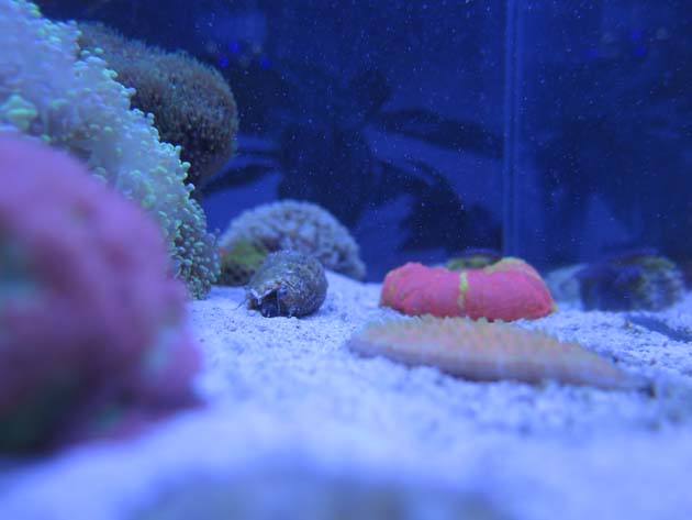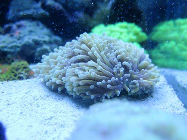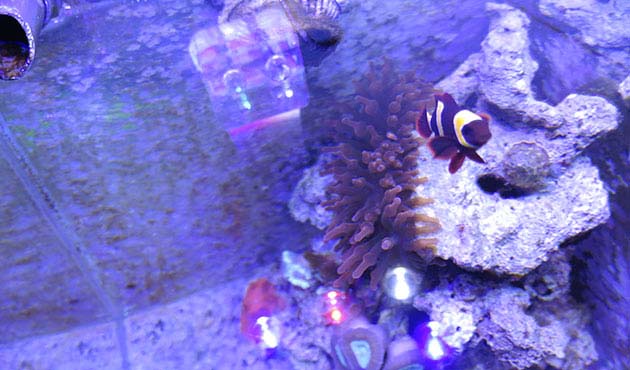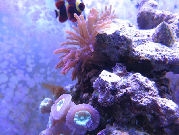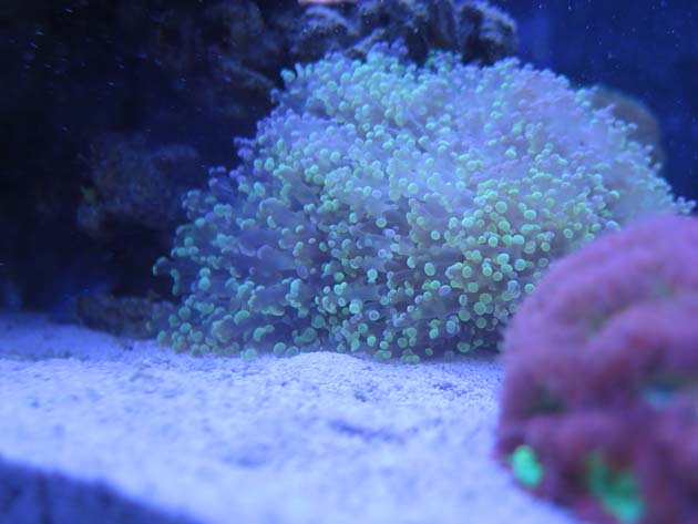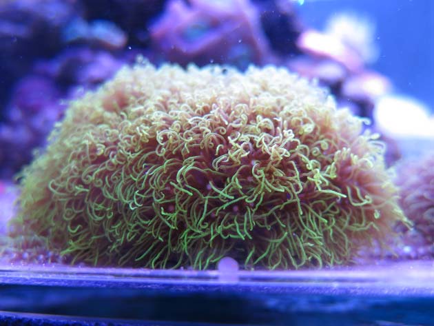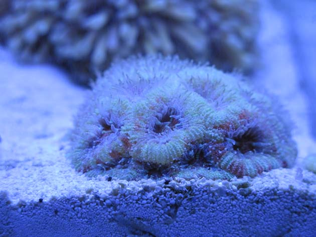 Una volta alla settimana cambio circa 15 litri di acqua, preparata attualmente con sale Fauna Marin; di solito cambio marca quando sto per finire ogni bidone. Ad oggi è il sale che preferisco, in quanto non noto segni di stress da parte di alcun animale e inoltre si scioglie immediatamente. Utilizzo il carbone attivo una settimana si e una no, inserito appositamente in una calza posta poco sopra la risalita. Non uso il carbone fisso in sump perché credo che impoverisca troppo l’acqua. Noto tra l’altro una maggiore estroflessione degli Lps quando non presente. Da quando ho iniziato con la nuova gestione alimento i coralli con zooplancton vivo attraverso il Newplanctondose, che mi “scarica” in vasca 5 ml di rotiferi vivi ogni ora. Da circa un mese doso anche Reef Vitality di fauna Marin. I pochi pesci vengono alimentati con il mangime del Dott. Bassleer, sia la versione con aglio che con quella senza, e più raramente con scaglie della Ocean Nutrition.
