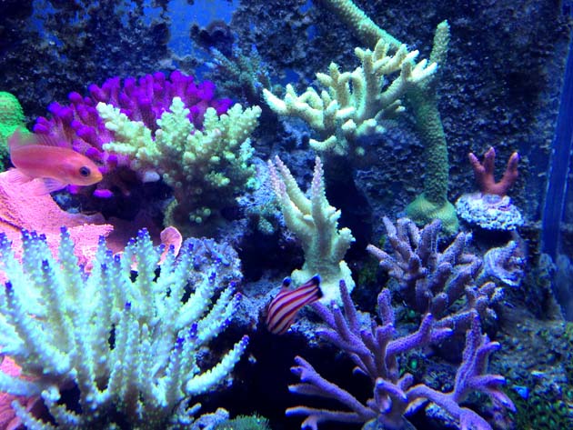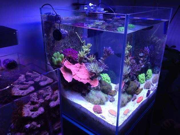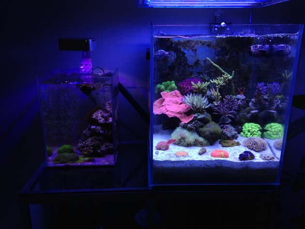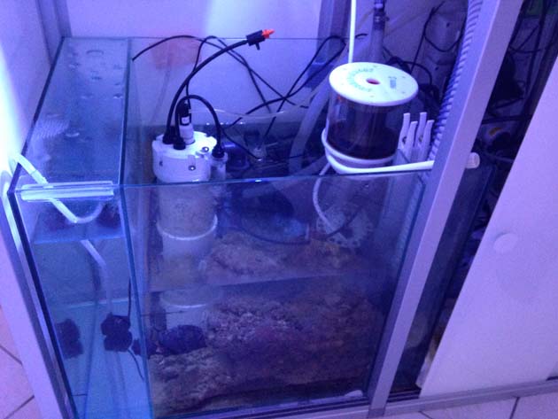 Ho così fatto fare un cubo artigianale con annesso mobile e sump. Oltre al cambio vasca ho deciso di cambiare anche gestione: stufo di avere troppe rocce e poco spazio per i coralli ho voluto provare con il Dsb, complice anche il fatto dei buoni risultati che si leggevano sul forum di Acquaportal. Da circa 3 mesi ho allestito anche un cubetto a fianco alla vasca principale, collegato alla stessa sump, proprio per togliermi qualche piccolo sfizio, anche se al momento non ho ancora inserito nulla di particolare.