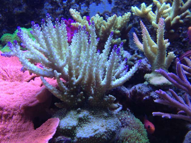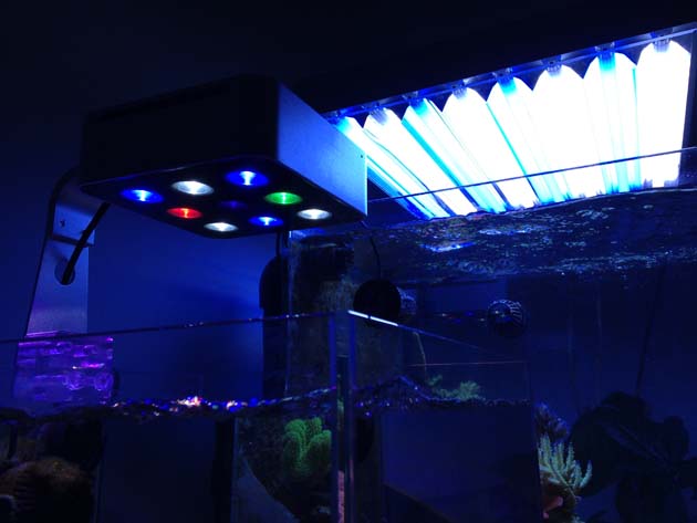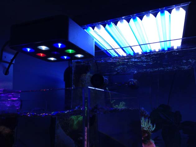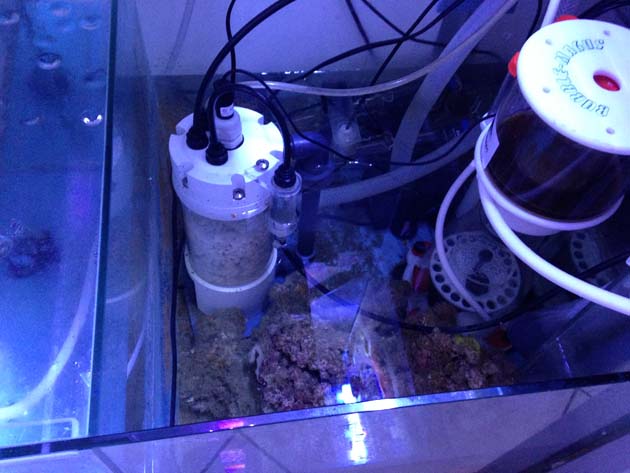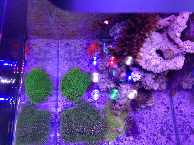 La vasca misura 50x50x60 mentre il cubetto 30x30x40, sono entrambe collegate alla sump che misura 45×55.40. Di seguito qualche dettaglio sulla tecnica: Il reintegro del Kh e del calcio, dopo vari mesi di integrazioni con gli A+B, è ora affidato ad un reattore UltraReef UCS100 Mini caricato con corallina Jumbo. La sonda e il controller Milwaukee mi permettono di gestire automaticamente il Ph all’interno del reattore. Dopo un anno e mezzo di Led con le varie Eshine, ho deciso di fare il salto di qualità installando una Ati Sunpower 8×24 trovata fortunatamente a Gennaio 2015. I neon sono della Fauna Marin, 4 Duo e 4 Royal e vengono accesi da mezzogiorno fino alle 11 di sera. Da subito i coralli hanno gradito decisamente il cambio luce, accentuando molto la loro colorazione.