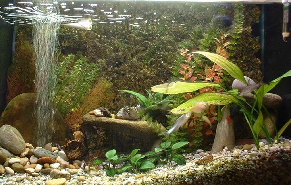 Dall’allestimento all’inagurazione(diciamo) sono passati 16giorni il fondo e formato da quarzo bianco,rosa e addirittura da sassolini trovati per terra uno ad uno.il fondo e scosceso per facilitare il ciclo mente i sassi sulla destra sono presenti per trattenere l’aria anche quanto l’areatore e spento, lo sfondo 3d è realizzato come da copione Acquaportal.