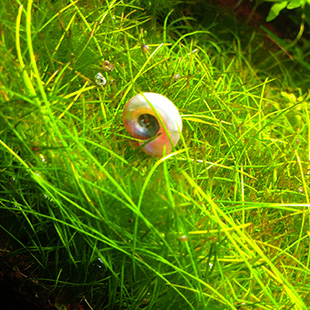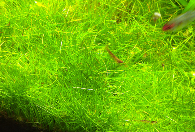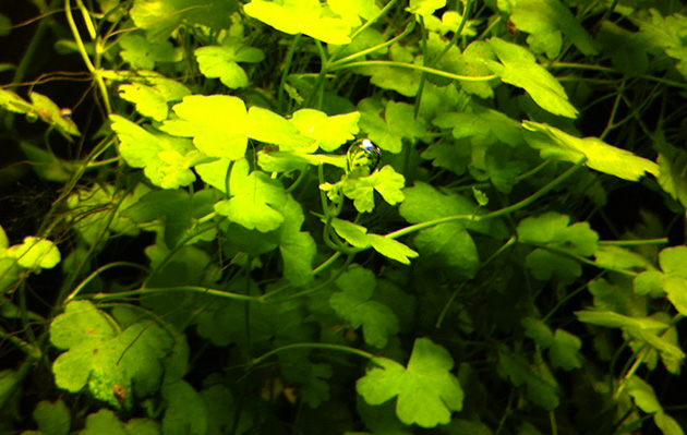 Al centro, sul fondo della vasca, capeggia un’Hygrophila difformis dalla crescita esplosiva. Sulla destra completano l’allestimento degli steli di Pogostemon erectus e l’Hydrocotyle sp. Japan. Ho voluto provare a realizzare un pratino sul fronte e mi sono affidato all’Eleocharis sp. Mini che in poche settimane ha ricoperto il fondo.