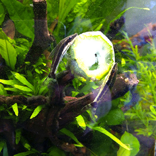 Sopra la radice sono state incastrate delle piante epifite, quali Microsorum pteropus, Microsorum pterus narrow e Anubias barteri nana. Al di sopra del Ceratophyllum demersum galleggiante ombreggia le piante e dà riparo ai pesci dalla luce.