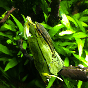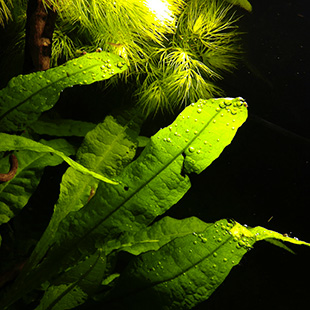Sopra la radice sono state incastrate delle piante epifite, quali Microsorum pteropus, Microsorum pterus narrow e Anubias barteri nana. Al di sopra del Ceratophyllum demersum galleggiante ombreggia le piante e dà riparo ai pesci dalla luce.