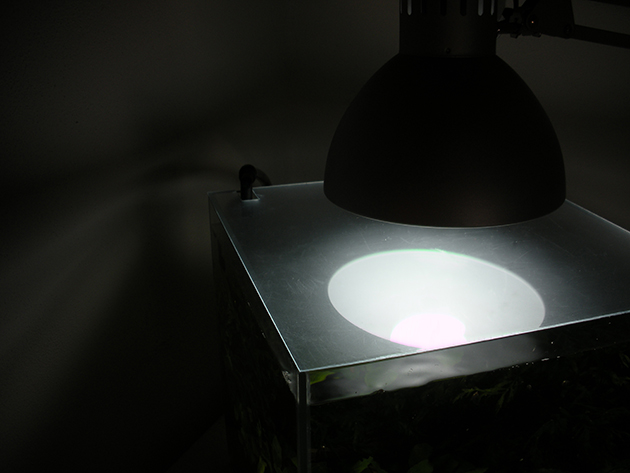 Per illuminare ho utilizzato una lampada da lavoro Tertial Ikea: poiché la vaschetta si trova su una scrivania,mi era comodo usare questo tipo di lampada.  La lampadina è una E27 da 23w 6500k.  All’inizio avevo messo una 32w, ma mi sembrava troppo, soprattutto all’inizio è meglio non esagerare con la luce. E’ inutile bombardare di luce una pianta che deve ancora attecchire. Così ho messo una 23w, direi più che sufficiente, la stessa dell’allestimento precedente. Il filtro è un Eden 501, ottimo per acquari di piccole dimensioni, ben nascosto dietro la vaschetta, grazie ad un cartoncino bianco. Trovo sempre molto comodo utilizzare le lampadine E27, anche quelle del supermercato, mantenendo la stessa plafoniera-portalampada: è sufficiente cambiare lampadina (mettendone un’altra con wattaggio diverso) per avere più o meno luce. A mio avviso questo è un grosso vantaggio. Purtroppo per loro natura tali lampadine si prestano ad essere usate solo all’esterno degli acquari , sospese sopra la vasca, non all’interno dove c’è condensa e umidità. In inverno la vaschetta, soprattutto se riscaldata, può essere chiusa con un pezzo di plexiglas trasparente, come nella foto seguente, per ridurre evaporazione e dispersione termica.