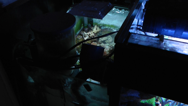L’illuminazione è fornita da una lampada costruita da me in vetroresina con 7 lampade T5 da 54 Watt. Il fotoperiodo totale è di 12 h. la circolazione è circa 25-30 volte il volume della vasca. nella vasca e nel refugium ci sono circa 50 Kg di pietre vive.