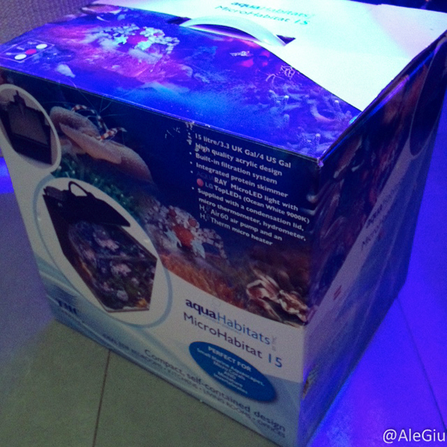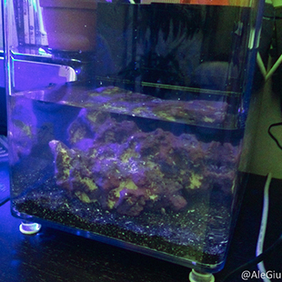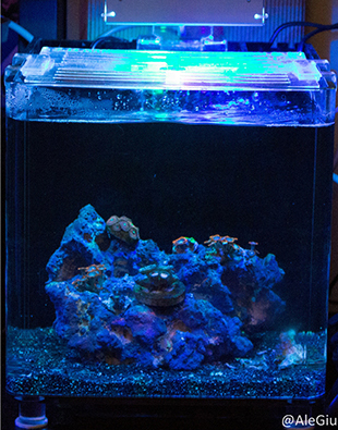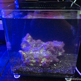 Ma parliamo della tecnica del nostro pico reef, per allestirlo abbiamo preso una vasca in acrilico TMC microhabitat 15 che nemmeno a farlo apposta è una perfetta riproduzione del nostro nanoreef che ci fa compagnia da anni, vicini sono bellissimi. La vaschetta al suo interno ha un piccolo skimmer a porosa (che abbiamo pensato di non utilizzare al momento), un riscaldatore e un vano pseudo sump con una pompetta da 300 lt/h che garantisce un buon movimento.