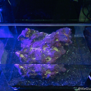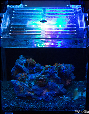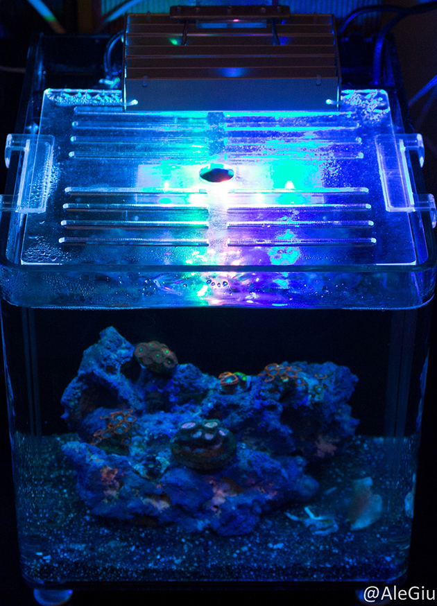 Insieme ad amici del forum che si sono occupati di realizzazione e creazione dello spettro, siamo passati all’illuminazione; la mini plafoniera artigianale (stessa forma rettangolare della radion che illumina il nano avviato, dando  definitivamente alla vaschetta l’aspetto di una sorta di  “fratello minore” neo arrivato). La lampada monta 8 led da 3 w presi su aquastyle, in fase di progettazione nell’ottica di garantire benessere e crescita ai coralli  erano stati preventivata come configurazione 1 White, 1 UV, 1 Actinic Violet, 2 Blu,1 Cyan, 1 Pink, dopo però diversi tentativi  ci siamo accorti che volevamo una luce più blu e intensa, senza ovviamente rinunciare alla soluzione migliore per i coralli, simo quindi giunti alla configurazione finale che attualmente è composta dai seguenti led: 2 blu, 1 Actinic Violet, 1 UV, 4 Royal Blue. Se sarà comunque un buon compresso per la visualizzazione delle fluorescenze e la crescita lo scopriremo con il tempo.