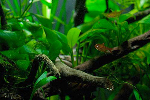 Il sistema di filtraggio di serie prevede un filtro interno caricato con sera siporax, una spugna a maglia grossa e lana di perlon, una pompa da 260 L/h ed un riscaldatore da 50w. L’illuminazione è forse l’apparato che più degli altri ha creato problemi: con una lampada a risparmio energetico da 14 watt con riflettore arrivo ad un rapporto di circa 0,3 watt/litro. Con poca luce la scelta delle piante è stata obbligata.
