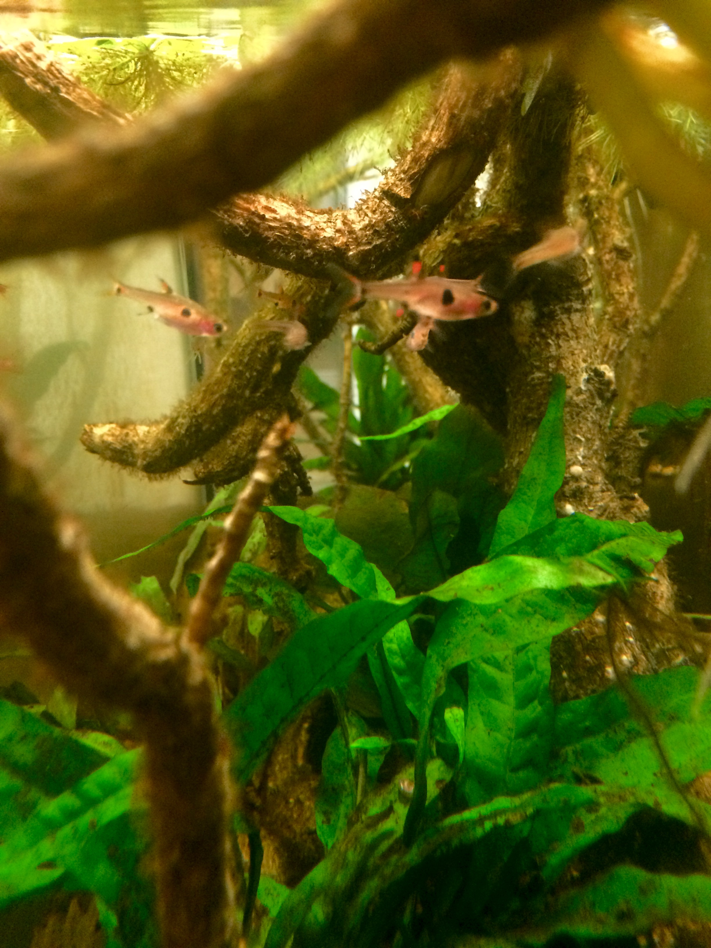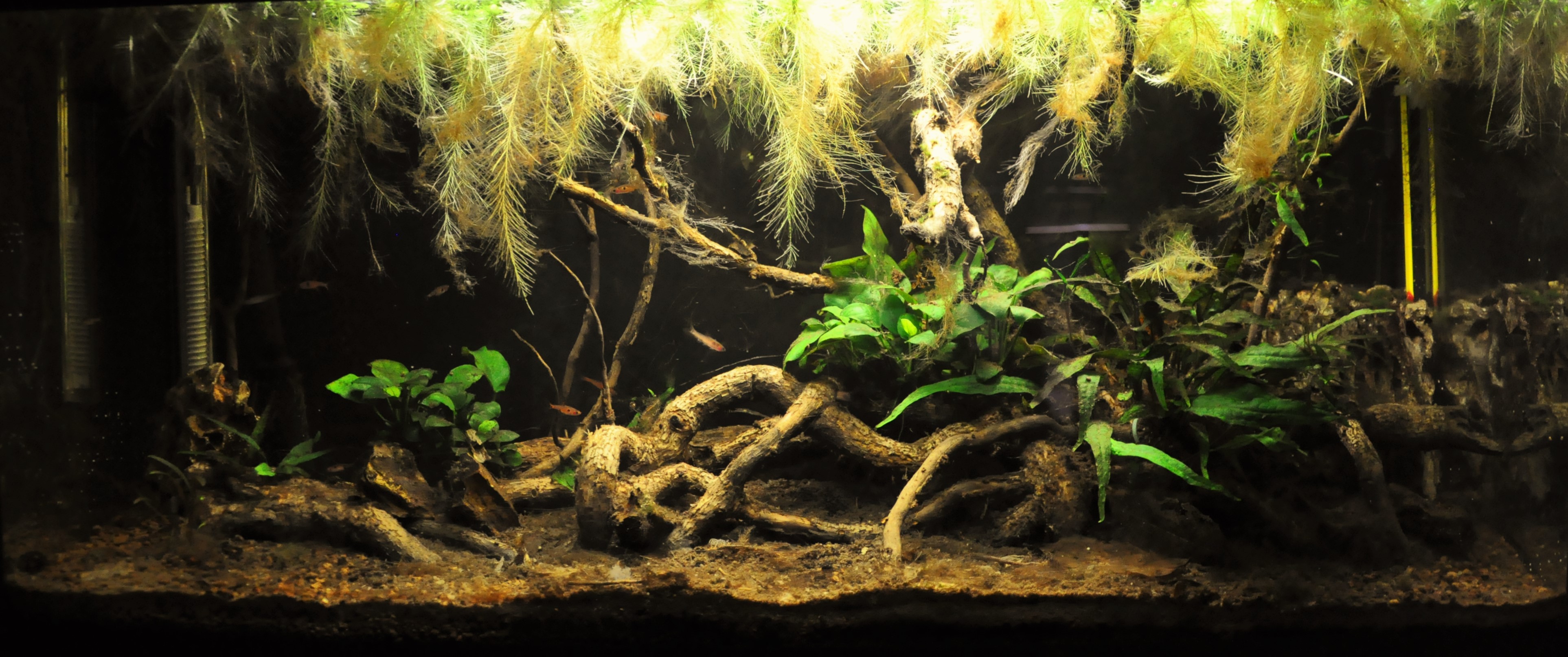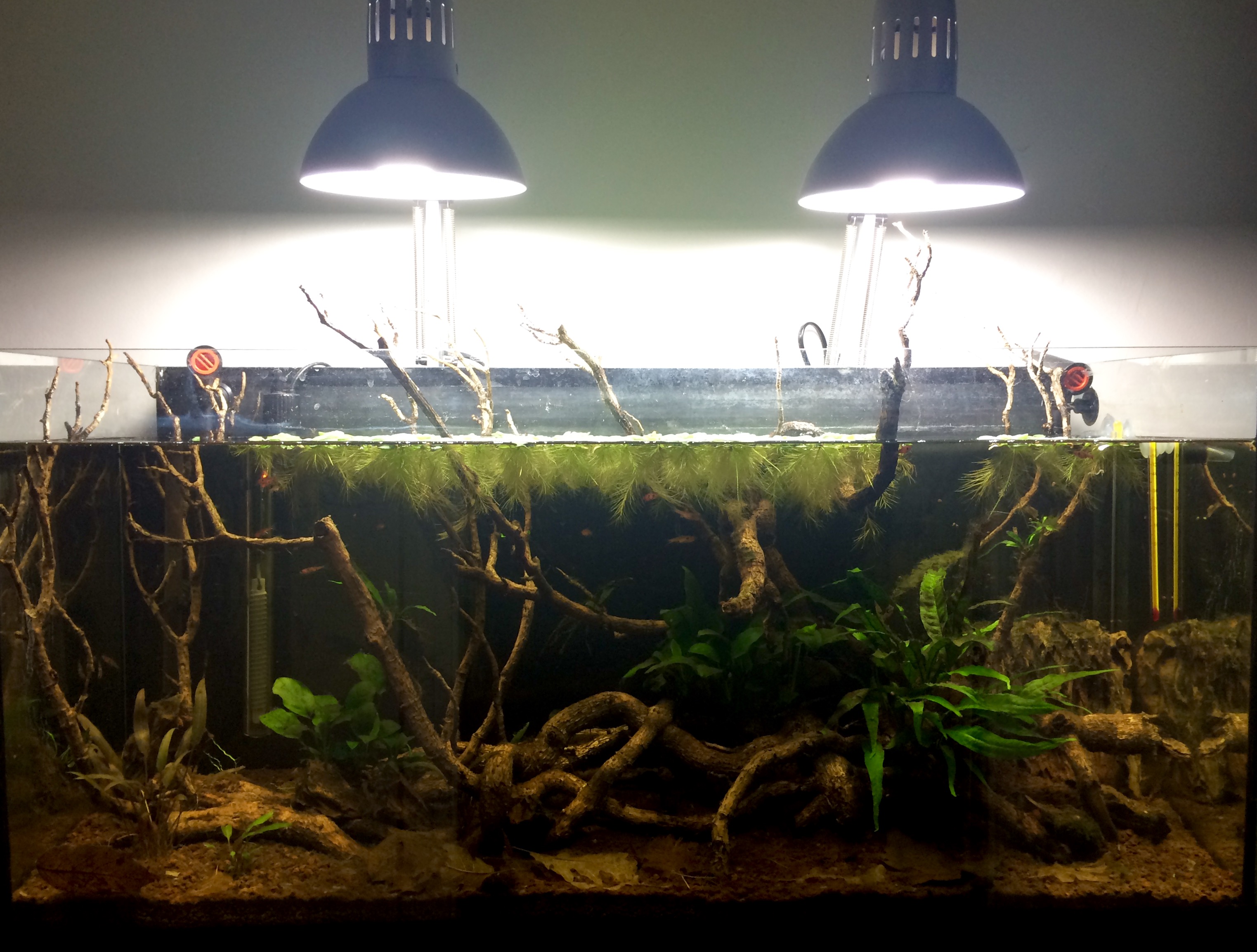 Tutto è iniziato quando a gennaio 2015 ricevo in regalo dalla mia compagna un acquario da 22 litri. Ho sempre desiderato avere un acquario e cercando informazioni su internet mi imbatto in Acquaportal, mi iscrivo al forum con mille domande e dubbi ma scopro subito con dispiacere che in un litraggio simile non posso inserire nemmeno un pesciolino. Le disponibilità economiche sono poche ma la voglia di vedere dei pesci nuotarci dentro tanta e come un bambino incosciente ci provo lo stesso. Metto 5 Boraras Maculata, i valori ci sono, i pesci sembrano stare bene ma dentro di me non mi sento soddisfatto e inizio ad informarmi sempre di più sul mondo dell’acquariologia e a cercare per loro una casa più consona. Scopro che un ragazzo regala un acquario da 100 litri lordi circa e in un giorno è già a casa. Visti i tempi e la mia compagna in dolce attesa mi dico che dovrà essere un acquario low cost, tolgo il coperchio che conteneva un neon “d’annata” da 18w e ci piazzo 2 portalampade prese da Ikea con lampade CFL da 24w ciascuna, i legni li trovo in un bosco vicino ad un lago, in quel periodo facevo le passeggiate con metro e sega al seguito.
