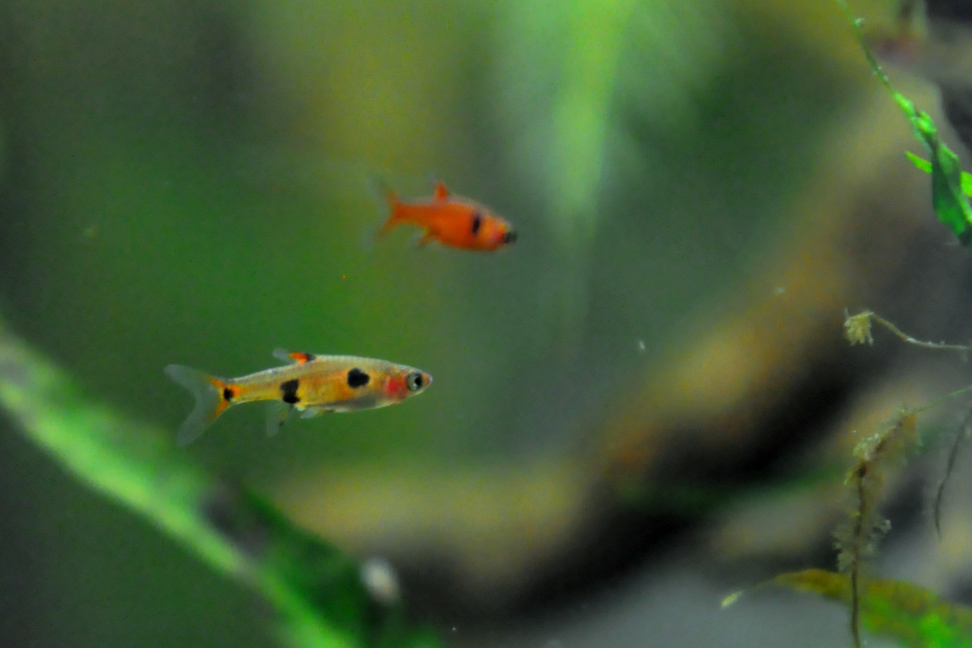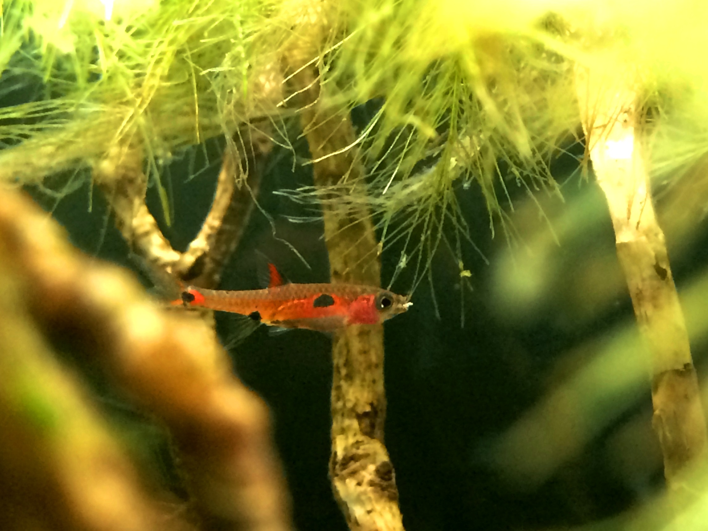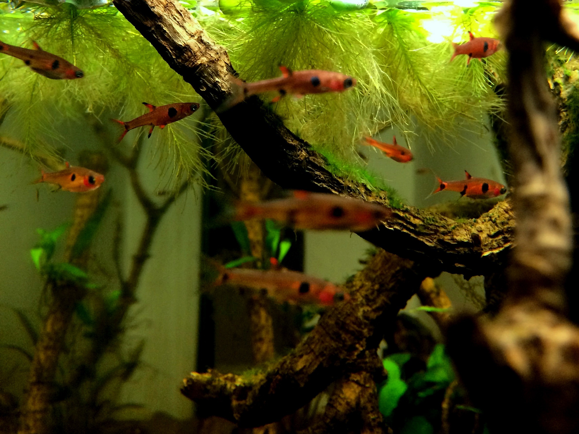 Il mio intento era quello di ricreare un ambiente il più naturale possibile, ed è anche per questo che i legni non sono stati privati della corteccia che col tempo si sta distaccando, depositandosi sul fondo e ha creato un substrato dall’aspetto veramente naturale. Sul fondo sono presenti anche foglie di quercia, di castagno e pignette di ontano che contribuiscono ad abbassare il PH e scurire l’acqua. Le Boraras Maculata sono diventate una trentina ed è impressionante vedere il loro vero colore che non si può apprezzare nelle vasche da esposizione dei negozi dove vengono tenute a PH 7,5 (misurato) mentre io le tengo a PH 6 e acqua molto tenera con Kh 3.