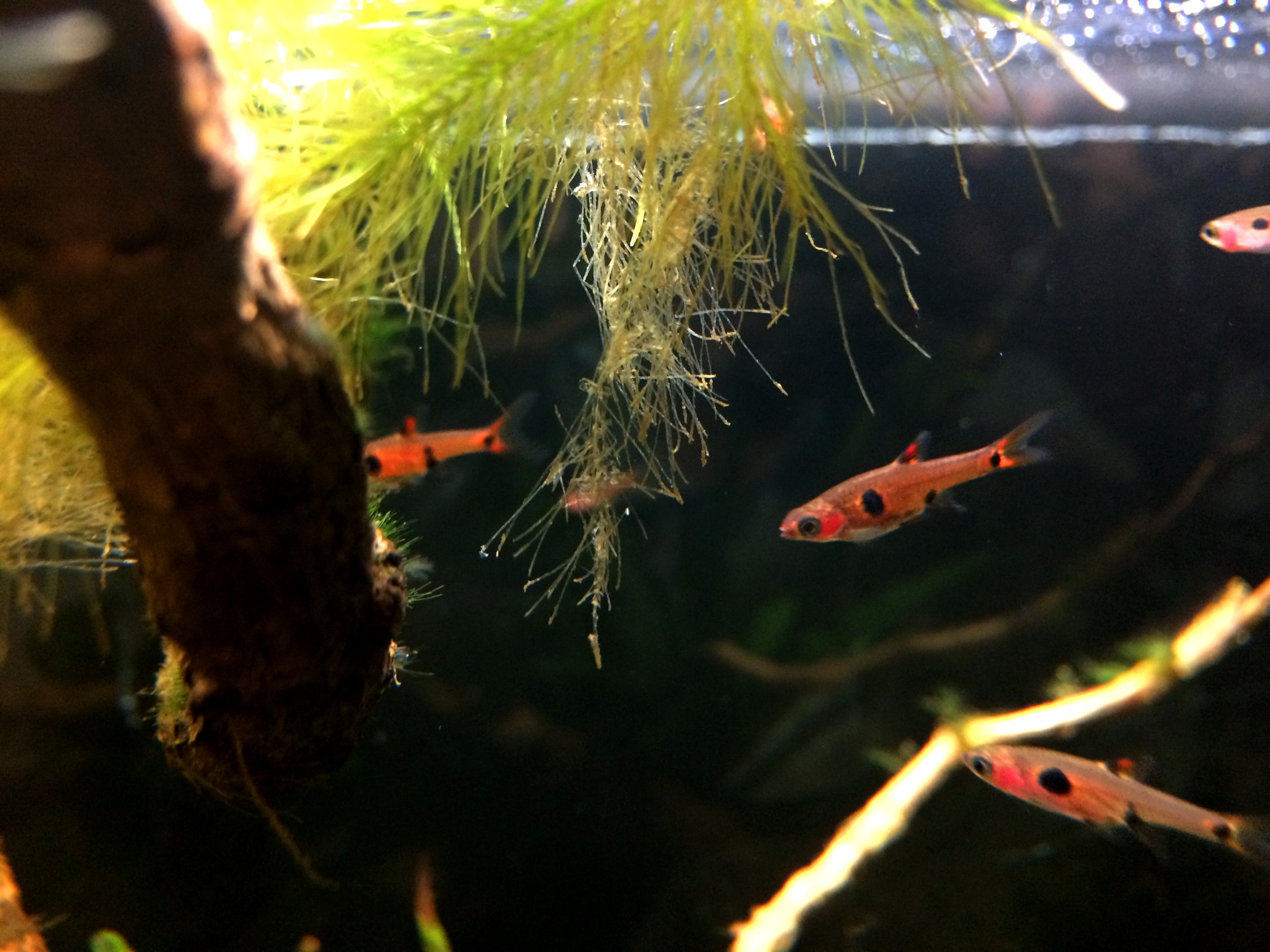 Tutto è iniziato quando a gennaio 2015 ricevo in regalo dalla mia compagna un acquario da 22 litri. Ho sempre desiderato avere un acquario e cercando informazioni su internet mi imbatto in Acquaportal, mi iscrivo al forum con mille domande e dubbi ma scopro subito con dispiacere che in un litraggio simile non posso inserire nemmeno un pesciolino. Le disponibilità economiche sono poche ma la voglia di vedere dei pesci nuotarci dentro tanta e come un bambino incosciente ci provo lo stesso. Metto 5 Boraras Maculata, i valori ci sono, i pesci sembrano stare bene ma dentro di me non mi sento soddisfatto e inizio ad informarmi sempre di più sul mondo dell’acquariologia e a cercare per loro una casa più consona. Scopro che un ragazzo regala un acquario da 100 litri lordi circa e in un giorno è già a casa. Visti i tempi e la mia compagna in dolce attesa mi dico che dovrà essere un acquario low cost, tolgo il coperchio che conteneva un neon “d’annata” da 18w e ci piazzo 2 portalampade prese da Ikea con lampade CFL da 24w ciascuna, i legni li trovo in un bosco vicino ad un lago, in quel periodo facevo le passeggiate con metro e sega al seguito.