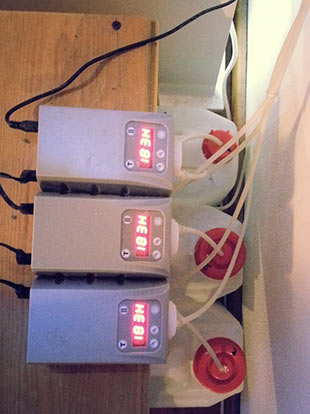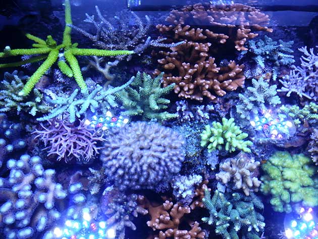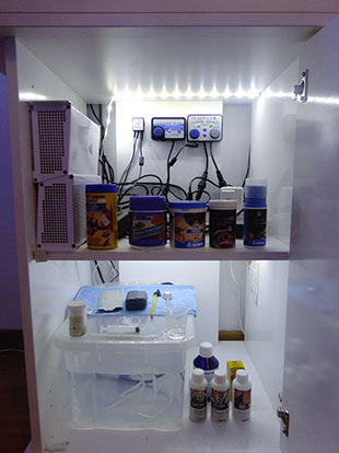Dopo aver provato ogni sorta di prodotto e vista l’assenza della sump, ho dovuto scegliere un sistema che non fosse il reattore di calcio e qui il metodo Balling ha fatto al caso mio. Utilizzo i prodotti della Triton, che associati a tre piccole pompe dosometriche dell’Aqua1, mi permettono di dosare ogni tre ore (da me impostate) le quantità misurate di calcio, kh e magnesio oltre a tutti gli altri oligoelementi che il classico metodo Balling non prevede. Prediligo questo tipo di integrazione perché mi permette di non avere cali di PH ed eventuali aumenti di concentrazione dei fosfati. Uniche pecche, un piccolo aumento della salinità dovuto ai prodotti integrati ed un costo maggiore. Utilizzo per l’acqua evaporata un osmoregolatore Tunze che funziona ottimamente, anche se la pompa può risultare piuttosto rumorosa. Produco l’acqua d’osmosi con un impianto Aqua1 a tre stadi. Riscaldatore Newa therm pro 200 w infrangibile, ventoline di raffreddamento Grothec.