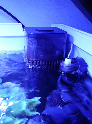 Inizialmente tutto è partito con i 2 t5 della Juwel, successivamente diventati 4, fino ad arrivare finalmente all’acquisto della prima RADION XR30W G2 140w seguita a breve dalla seconda G2 PRO 170w. Pur riconoscendo che il led non agevoli fin da subito i principianti come me, devo dire che sono veramente entusiasta di queste lampade, sia per l’effetto scenico che danno alla vasca, sia per la colorazione e la crescita dei coralli( per me)già buona. I tiraggi nelle parti più ombreggiate di alcune acropore ed una vasca costantemente affamata e magra, possono essere le maggiori difficoltà riscontrabili. Per quanto riguarda i consumi, la gestione e la manutenzione, considero queste plafoniere insostituibili. Fotoperiodo: accensione 11:30 e spegnimento ore 23:00, programma artificial con percentuali dei led da me impostati, alba e tramonto. Utilizzo 2 pompe Jebao WP 25 poste ai lati della vasca, purtroppo su una lunghezza di 70 cm non riesco a sfruttare appieno il loro moto ondoso e la maggior parte del tempo funzionano costanti a 4000 l/h, che è la metà della loro potenza massima. Ritengo queste pompe ottime, sia per il rapporto qualità–prezzo, sia per le ridotte dimensioni associate ad una buona silenziosità e direzionabilità.
