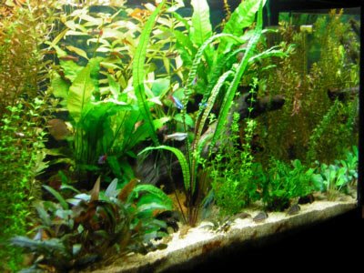 Una volta al mese circa cambio la lana di perlon, il carbone attivo e controllo la pompa .  | Parte centrale della vasca dove spicca la Cryptocoryne Balansae |