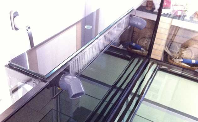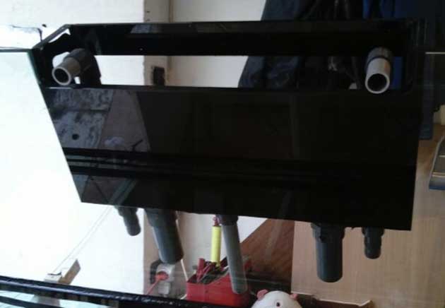 Movimento in vasca: Ho preferito una vasca priva di tubi di tracimazione o pozzetti al suo interno, così ho fatto eseguire un pettine sul lato lungo posteriore della vasca lungo 60 cm dove alle estremità sono state posizionate le uscite diametro 32. Per la ricaduta due scarichi del 50, il terzo scarico del 25 viene utilizzato per il reattore di zeolite.