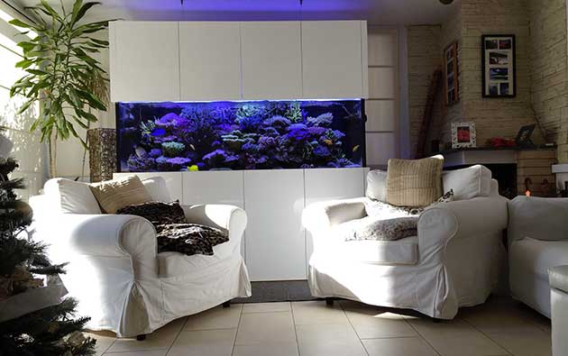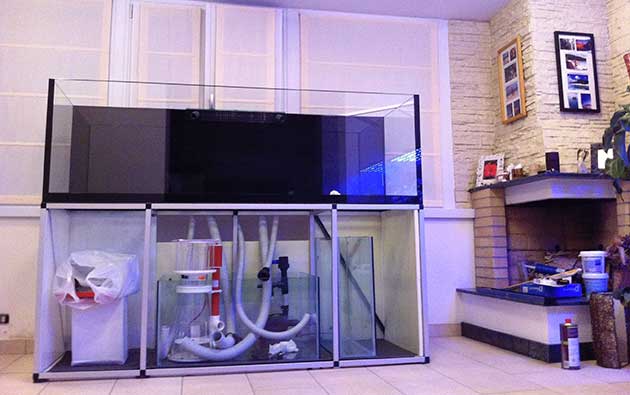 ![]() Premetto che sin da quando avevo 16 anni ho avuto un acquario in casa e la “malattia” del reef è in me da oltre 16 anni. In tutti questi anni mi sono aggiornato nei vari forum cercando però di rimanere più vicino possibile alla vita reale che si svolge in natura…. come?…documentandomi il più possibile con riviste e pubblicazioni varie di biologia ed altro, il tutto per evitare di seguire mode commerciali che girano attorno a questo fantastico hobby. La vasca che sto per presentarvi è la quarta in ordine di gestione ed è la prima che ho fatto fare su misura perché volevo il massimo dell’armonia nella stanza, per creare un ambiente congeniale e piacevole a me e a mia moglie…;) La vasca: