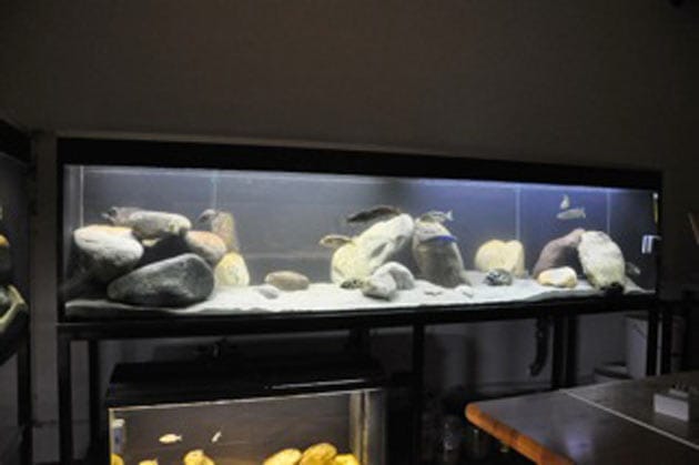 | L’acquario di Luca Vaccarino e una vasca artigianale 250x70x60 con vetri da 12mm tirantata con 2 tiranti orizzontali e 1 verticale. Dedicata ai predatori del lago Malawi è stata avviata a luglio 2011.