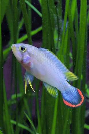 La caudale ha una vistosa orlatura rossa su tutto il suo bordo esterno e una macchia nera che si estende perfino sul peduncolo caudale. La pinna anale è completamente gialla tenue.