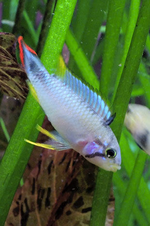 Nel frattempo non erano rari momenti in cui il maschio corteggiava la femmina con lo stile tipico degli Apistogramma, mostrandosi di fronte alla femmina con il fianco in bella vista, accentuando notevolmente la colorazione, dispiegando il più possibile la pinna dorsale e le ventrali e richiudendo leggermente la caudale per prodursi nel classico balletto-tremolio rituale.