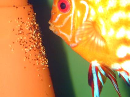 Mai acquistare un solo discus sono pesci di branco che soffrono la solitudine. Per un acquario di dimensione 100x40x40 Cm, la miglior cosa sarebbe comprare 6-8 discus di 5-6 cm di diametro che se ben tenuti dopo circa 6 mesi cominceranno a formare delle coppie. Durante questo periodo di sviluppo bisogna alimentarli per almeno 3 volte al giorno somministrando la mattina cibo in granuli, a mezzogiorno cibo in scaglie e la sera cibo vivo o surgelato. Il cibo surgelato deve essere prima lavato accuratamente e poi somministrato ai pesci altrimenti potrebbe inquinare l’acqua dell’acquario. Poichè il discus è sensibile all’eccessiva concentrazione di nitrati è opportuno sifonare il fondo ed effettuare un cambio dell’acqua settimanale sostituendo il 20 % del volume dell’acquario. Riproduzione: Vi è un netto divario tra la riproduzione di discus selvatici e quella dei discus di allevamento. Questi ultimi presentano meno difficoltà nella formazione delle coppie e nella deposizione grazie alla maggiore tolleranza dei valori dell’acqua non ideali, però al contrario dei discus selvatici questi hanno spesso difficoltà nell’allevamento della prole poichè a causa della eccessiva selezione genetica attuata hanno perso in parte l’istinto naturale della protezione della prole. Tralasciando la difficile riproduzione dei discus selvatici, vi parlerà di quella dei discus di allevamento. Una volta formata la coppia nell’acquario di comunità si passa all’allestimento di una vasca speciale dedicata solo alla riproduzione. Questa vasca dovrebbe essere un cubo di 50 cm di lato in modo da rendere più facile ai riproduttori la raccolta delle larve. Questa vasca non deve avere nessun arredamento tranne un cono di terracotta o un tubo in PVC che funga da substrato per la deposizione. I valori dell’acqua da riproduzione devono essere: pH 5,5 – Conduttività 150 microsimens, nitriti assenti, nitrati molto vicini allo 0 e temperatura a 28 °C. La coppia pronta alla deposizione, riconoscibile dai tremolii del corpo, viene trasferita nella vasca da riproduzione e dopo qualche giorno si avrà la deposizione. Ora si riconoscerà il sesso dei riproduttori osservando le papille genitali, il maschio ha la papilla genitale appuntita mentre la femmina a tronco di cono. Prima di deporre entrambi puliscono accuratamente il substrato scelto e poi la femmina comincerà a deporre numerose file di uova seguita dal maschio che provvederà a fecondarle. Una covata media può portare alla deposizione di 200-300 uova , naturalmente non tutte si schiuderanno.