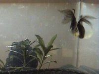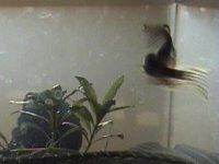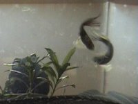 Nascita ed accrescimento degli avannotti Le larve si muovono raramente, rimanendo attaccate al fondo o alle pareti della vaschetta e consumando il sacco vitellino (non visibile) per un paio di giorni, durante i quali non hanno bisogno di alcun nutrimento. Fornisco loro, di tanto in tanto, una leggera aerazione posizionando una piccola porosa vicina alla superficie dell’acqua, in modo da creare un leggero movimento ed evitare così che si formi una patina superficiale che potrebbe impedire ai piccoli di aprire la vescica natatoria. Quando iniziano a muoversi (solitamente al terzo giorno) sarà necessario provvedere al primo nutrimento, che potrà essere costituito da batteri allevati ad hoc oppure da mangimi liquidi specifici. Personalmente, pur avendo avviato in passato le classiche colture di batteri con fieno, buccia di banana, ecc., da diverso tempo utilizzo solamente mangimi liquidi oppure in polvere finissima, che provvedo a miscelare ben bene in un bicchiere per poi versare delicatamente il contenuto nella vaschetta; sebbene sarebbe consigliabile alimentare gli avannotti 3-4 volte al giorno, in considerazione agli impegni di lavoro fornisco loro il cibo solo due volte (la mattina, prima di uscire di casa, e la sera, quando ritorno), per tal motivo preferisco eccedere con la quantità (il surplus dovrà però essere eliminato con frequenti pulizie del fondo). Con l’avvio dell’alimentazione, provvedo anche ad inserire nella vaschetta un piccolo filtro in spugna (acquistato in negozio), collegato ad un aeratore, che fornisce un lieve movimento dell’acqua, l’ossigenazione ed in minima parte anche un piccolo filtraggio biologico. Malgrado tale apparecchio ritengo comunque fondamentale una periodica sostituzione parziale dell’acqua (circa un bicchiere, di plastica, al giorno). Provvedo quindi con un tubicino (di quelli usati per l’aeratore) a togliere l’acqua, liberando nel contempo il fondo dalla sporcizia creata soprattutto dal mangime non consumato, sostituendola con un uguale quantità della solita acqua nuova utilizzata per i cambi. Diminuendo i cambi d’acqua, soprattutto nei primi giorni di alimentazione, ho potuto osservare un’elevata moria di avannotti ed una proliferazione di piccoli micro vermetti, che certo non rientrano nelle intenzioni iniziali.