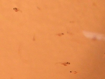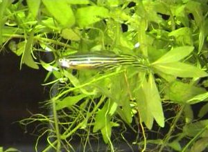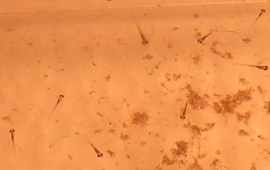 Per verificare il buon fine dell’operazione è possibile osservare se il ventre della femmina si è ridotto, oppure cercare sul fondo delle piccole palline quasi trasparenti, del diametro di 1-2 mm. Per riuscire a vedere le uova sul fondo, sotto la retina, guardo frontalmente posizionando una piccola torcia di lato o di fronte. Sul fondo non dovrebbe esserci sporcizia, vista la recente introduzione dei pesci in acqua pulita, così le uova dovrebbero essere visibili. Che l’operazione sia andata a buon fine o meno, il giorno dopo riporto i riproduttori nel loro acquario; non lascio mai i Brachydanio più di 24 ore a provarci, a differenza di altri pesci che hanno spesso bisogno di 2-3 giorni. Tolti i riproduttori, provvedo anche a togliere con delicatezza sasso, piantina e retina, dando una piccola scrollata in acqua per far cadere eventuali uova rimaste sugli oggetti. E’ importante togliere il prima possibile i genitori e gli oggetti (in particolare la pianta), onde evitare un maggior inquinamento dell’acqua; le uova potrebbero infatti essere attaccate dai batteri e quindi morire. In una covata di 100-200 uova è comunque normale che alcune uova ammuffiscano; mentre quelle sane rimangono semi trasparenti, quelle morte appaiono di un bianco intenso e vengono immediatamente ricoperte da una leggera muffa. Dalle prove che ho condotto, ho potuto constatare che le uova temono, più che l’attacco dei batteri, la luce (fotosensibilità); fin dalle prime riproduzioni compiute provvedo quindi sempre a mantenere le vaschette coperte con un panno scuro perché anche posizionandole in luogo ombreggiato (cioè senza luce diretta) ho rilevato numerose perdite, probabilmente questa maggiore sensibilità è dovuta anche al lungo periodo di incubazione; va da se che i controlli con la torcia sono saltuari e soprattutto rapidi.