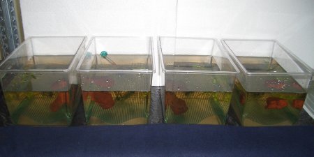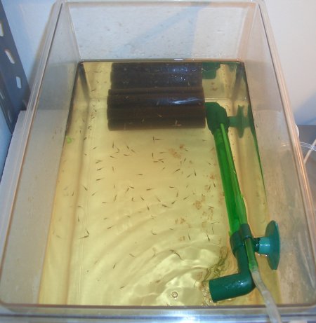 Dopo 10-15 giorni di alimentazione gli avannotti sono cresciuti ben poco, ma comincio a fornire loro anche i primi naupli di artemia, grazie ai quali la crescita diventa molto più rapida. Continuo comunque a somministrare ancora per qualche giorno il mangime liquido o in polvere, anche perché (come tutte le specie) i pesci, pur di una stessa covata, non crescono mai tutti contemporaneamente; ci si trova così con avannotti un po’ più grandi ed altri un po’ più piccoli.