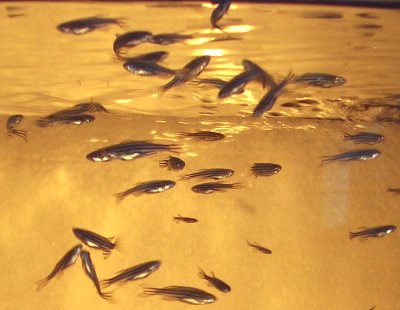 Dopo circa un mese dalla nascita si cominciano a notare i disegni ed i colori dei pesci (i Rerio sembra abbiano una sola riga scura), la lunghezza è di circa 1 cm; provvedo quindi a trasferire i più cresciuti in un acquario più grande (21 litri) e man mano che crescono sposto anche gli altri; qui possono essere nutriti con mangime in polvere per avannotti od anche in piccole scaglie (possibilmente ad elevato contenuto di proteine).