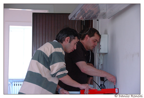 Pfft sulla sinistra e ***dani*** sulla destra cercano di mettere in bolla il sostegno in alluminio