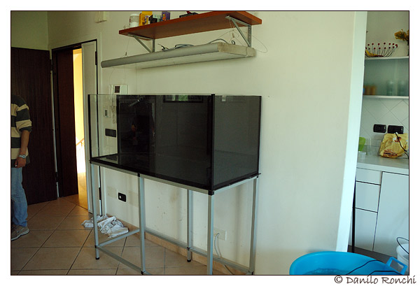 Nel mio caso c’era un mobile in alluminio (che ho odiato in quanto non sono mai riuscito a farci un mobile decente attorno) e la vasca. Una particolare attenzione deve essere posta al nuovo posizionamento cercando di mantenere in bolla il più possibile il nuovo mobile ed il nuovo acquario. Con il mobile in alluminio è abbastanza semplice in quanto sotto ogni gamba vi è un piedino filettato… non cercate però di fare come noi, e cioè di mettere in bolla l’alluminio senza la vasca sopra, perché poi sarà impossibile metterci la vasca senza muoverlo 😉 io vi ho avvertito!