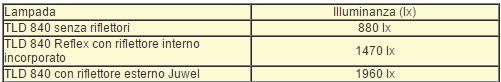 L’illuminanza fornita è stata misurata con un luxmetro in un punto al di sotto la lampada (disposta orizzontalmente) ad una distanza di 45 cm dall’asse della lampada, in corrispondenza della metà precisa della lunghezza della lampada.