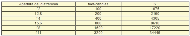 Se l’oggetto inquadrato è verde (come la vegetazione), allora occorre correggere la lettura fatta aumentando di circa 2 stop (ad esempio, se la lettura è f 4, aggiungere 2 stop, cosicché la illuminanza risulta di 1600 foot-candles). Si ricorda che 1 lux equivale ad avere 1 lm/m² mentre 1 foot-candle equivale ad avere 1 lm/ft².