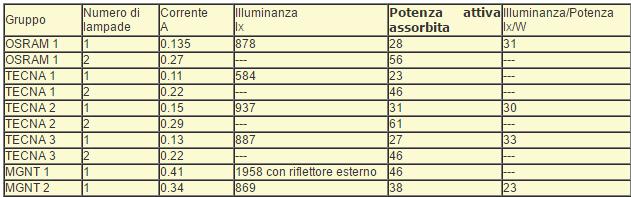 Nel caso delle prove con una sola lampada è stata anche misurata con un luxmetro l’illuminanza fornita in un punto al di sotto della stessa ad una distanza di 45 cm dal suo asse, in corrispondenza della metà della lunghezza.