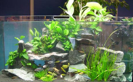 L’ideale è formare una parete di rocce che parte da 5-10 cm dal vetro frontale e si innalza per tutta la lunghezza della vasca fino al pelo dell’acqua.