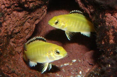 Labidochromis caeruleus nascosti in un anfratto. (Foto di A. Massi)
