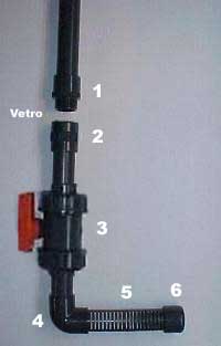 Gli schiumatoi sono stati posizionati su di una struttura in vetro e collegati alla pompa con tubi in PVC ad incollaggio.  | 1) Schiumatoio