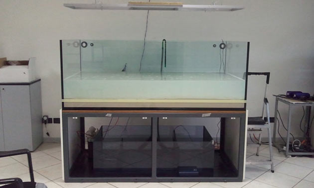 Dopo che la maggior parte del pulviscolo rilasciato dalla sabbia si è posato, si procede al riempimento della vasca e all’avvio delle pompe di risalita e dello schiumatoio.
