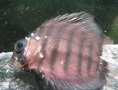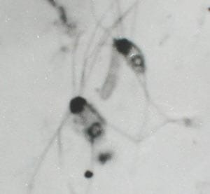 Per l’esame viene allestito un preparato di frammenti di feci appena espulse da pesci vivi. Da pesci appena morti o uccisi si prelevano parti del retto e dell’intestino medio, nonché la cistifellea. Una determinazione del genere del parassita può essere effettuata solo con esemplari fissati. Questi flagellati si riconoscono ad un ingrandimento minimo di 120 volte; per la differenziazione è necessario un ingrandimento di 300-400 volte. Secondo G. SCHUBERT (comunicazione orale, 1987) non è mai stata dimostrata la presenza di Hexamita nei Discus. Anche il flagellato Spironucleus è soltanto una delle cause possibili della Malattia del buco nei Ciclidi. Esso si trova prevalentemente nell’intestino, che si può riempire di milioni di questi flagellati. E’ possibile una diffusione nella cistifellea e nel sangue. In tal caso l’infezione, generalmente, ha esito mortale. Hexamita e Spironucleus hanno una cellula ovale allungata. Dall’estremità anteriore fuoriescono otto flagelli di cui due arrivano alla parte posteriore estendendosi lungo un solco sulla superficie cellulare. Nella parte posteriore questi due flagelli oltrepassano abbondantemente il corpo cellulare. I sei flagelli anteriori sono molto mobili e servono alla locomozione. Il nuoto dei due flagellati, rotanti sull’asse longitudinale, è rettilineo; Hexamita è un po’ più lento di Spironucleus. Hexamita salmonis ha una lunghezza di 6-12 cm ed è largo 6-8 cm. Spironucleus elegans è un po’ più corto, con una lunghezza di 8-11 mm e una larghezza di 4-6 cm. 1 nuclei di Spironucleus sono più grandi di quelli presenti in Hexamita. Le tricomonadi hanno un corpo cellulare sacciforme, lungo mediamente 12 cm. Sul polo superiore hanno origine quattro flagelli di cui tre battono insieme su e giù nell’acqua contemporaneamente. II quarto flagello segue una linea ondulata dall’alto verso il basso lungo la superficie cellulare ed è unito a quest’ultima tramite una sottile membrana (membrana ondulante). Le tricomonadi hanno nuoto molto lento, dondolando pigramente.