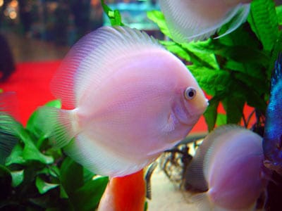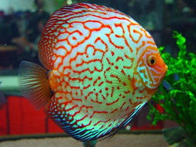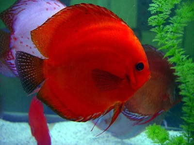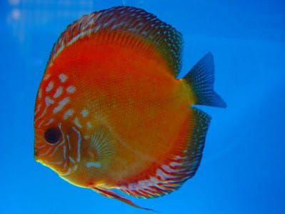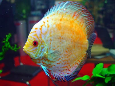 A tal proposito, chiedete che sia distribuito del cibo in vasca, un Discus sano è sicuramente anche molto vorace. Chiaramente il pesce non deve apparire smagrito, la fronte deve curvare gradatamente e presentare un certo spessore, il cosiddetto dorso a “lama di coltello” indica un pesce malnutrito o con patologie in corso. Discus piccoli dai colori troppo intensi potrebbero essere stati allevati con ormoni e sostanze coloranti: le pinne pettorali e caudali non devono mostrarsi rosse, ma trasparenti. In Discus adulti dai colori ben formati lo scolorimento, come una macchia sbiadita, nell’ultima parte del corpo, può essere sintomo di una deformazione alla spina dorsale che è abbastanza frequente in questa specie e che è un problema di natura genetica.