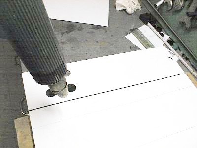 A questo punto prendiamo la lastra, la posiamo su di uno spigolo vivo di una tavola ed incominciamo a scaldare lungo l’intaglio con una pistola termica ( si dovrebbe riuscire bene anche con un grosso phon).
