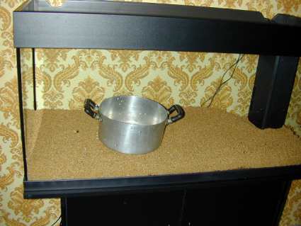 Cosa ci fa una pentola nell’acquario? Senza di essa saremmo rovinati! La pentola servirà per evitare che si creino delle buche mentre versiamo l’acqua all’interno. Questo è importante, perchè così evitiamo alla terra di tornare in superficie.