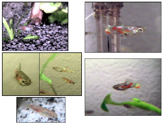 I maschi invece di tutti e due i tipi sono coloratissimi, tranne le pinne che sono tutte trasparenti. Lungo tutto il corpo hanno macchie Rosse, Azzurro/Blu con riflessi Verdi, gli distingue il colore di base che nei Normali è il grigio, negli Albini il giallognolo. Particolare è una macchia nera e bianca in prossimità della coda. Come in gran parte dei pesci, i maschi sono + piccoli delle femmine, diciamo che raggiungono i 2,5 cm contro i 4/4,5cm delle femmine (in ogni caso sia i maschi che le femmine rimangono + piccoli dei ispettivi fratelli Commerciali), in ogni caso formano un bella coppia. Dopo il primo parto ho avuto modo di verificare che non si verificano fenomeni di cannibalismo cioè che ne le femmine ne i maschi si cibano, o cacciano i piccoli avannotti. Il numero di avannotti nati da un parto dipende dall’età della femmina e variano da un minimo di 10 a un massimo di 30 circa. I fenotipi sono ripetuti nei piccoli, ciò significa che nascono sempre maschi uguali e femmine uguali in tutte i tipi, Normali e Albini.(che comunque si incrociano tra loro). I piccoli per la prima settimana si nutrono di niente ovvero raccattano cibo sul fondo, sulle piante scorrazzando liberi, poi iniziano a cibarsi delle sminuzzature di cibo degli adulti e via via crescono fino a che, ad un mese di età, i maschi iniziano a colorarsi e le femmine diventano mature. Sono molto resistenti e si adattano molto facilmente a varie temperature, ho avuto modo di tenerli in vasche a 24 gradi per arrivare a vasche con 28/29 gradi. Credo che sopravvivano anche a temperature molto + fredde, diciamo di 18°. Si adattano anche alla durezza dell’acqua, al kh, al ph, a tutto basta tenere bassi NO2 e NO3.