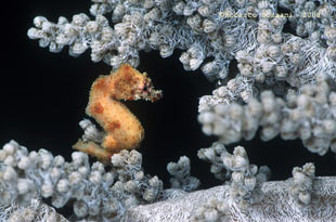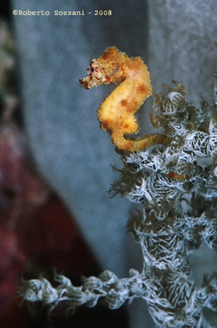 Comportamento:Ho passato molto tempo, durante il mio soggiorno, ad osservare questo cavalluccio pigmeo. Quando non viene disturbato, resta immobile e ben nascosto tra i polipi appuntiti del corallo. Ma ha dimostrato anche molta mobilità: al minimo disturbo lasciava la presa e cominciava a nuotare, anche per circa un minuto, senza alcun movimento apparente del corpo. Sul pinnacolo c’erano diversi piccoli alcionari e lui si spostava frequentemente da uno all’altro, a volte percorrendo anche l’intera circonferenza del pinnacolo. In questo comportamento e abilità nel nuoto, assomiglia all’Hippocampus pontohi, mentre è l’opposto dei cavallucci pigmei delle gorgonie, Hippocampus bargibanti e Hippocampus denise, che in rarissime occasioni, quando disturbati, lasciano la presa e sempre solo per veloci spostamenti di pochi centimetri. In generale mi è sembrato molto timido e sensibile ad ogni fonte di luce, nonostante abbia scelto un habitat a bassa profondità, ricco di luce naturale. Ho cercato di fotografarlo sempre durante le ore di massima luce, per ridurre l’impatto del flash, dopo aver capito che non apprezzava le mie attenzioni, ma anche così, molto spesso, lasciava la presa e cominciava a nuotare in cerca di un punto più protetto e nascosto. Si ringrazia Roberto Sozzani per la concessione dell’articolo  |