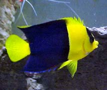 La colorazione gialla della testa, segno distintivo degli esemplari giovani, sparisce completamente in età adulta. Centropyge bicolor