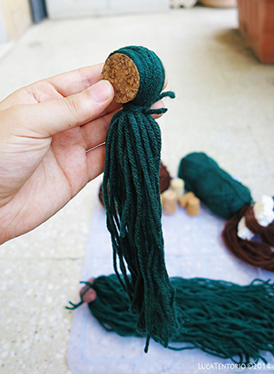 4) Con un pezzo di lana (lungo circa 15 cm) legate la ciocca nel mezzo così da ottenere un fiocco centrale e due spezzoni di matassa che cadono ai lati.