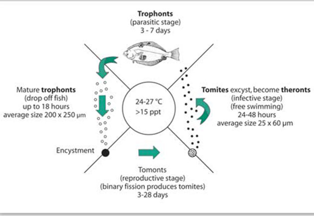 Il breve ciclo di vita del Cryptocaryon irritans comincia con l’infezione del pesce da parte del protozoo, che gli si attacca alla pelle tramite due uncini detti ciglia. Il parassita per sopravvivere e riprodursi ha la necessità di trascorre un periodo di tempo aggrappato alle pelle, alle branchie o agli occhi di un pesce. Questo periodo dura tra 3 ai 7 giorni considerando temperature e salinità medie delle vasche tropicali (26 °C e 1.026 di densità ). In questo stadio si nutre dei tessuti dell’ospite e cresce fino 370 micron. Raggiunta la maturità, il parassita si stacca dal pesce fluttuando nell’acqua fino a lasciarsi cadere sul fondo. In meno di 24 ore dal momento in cui si è liberato, si attacca al substrato e si trasforma in ciste. La sua dimensione in questo stadio varia da 0,2 a 0,4 millimetri. Il pesce in questa fase si presenta nuovamente pulito, privo di tutti i puntini come prima di aver contratto la parassitosi ed è errore dei principianti ritenere risolta e superata l’infestazione, senza avere fatto nulla. Invece, dentro le cisti cadute sul fondo, i parassiti si riproducono ad un ritmo vorticoso e all’interno di ciascuna di esse possono svilupparsi anche 200 nuovi tomiti (questo è il nome che prendono i parassiti in questo stadio). Lo stadio di tomita ha una durata variabile fra i 3 e i 28 giorni e, una volta maturi, i parassiti rompono la parete della ciste e iniziano a nuotare nell’acqua alla ricerca di un ospite al quale attaccarsi, cosa che se non avviene entro poche ore, muoiono. Se invece riescono ad aggrapparsi ad un pesce, si insinuano nei tessuti del malcapitato e così riparte un nuovo ciclo di vita. Se il pesce è in forma e ben alimentato, le ondate successive di parassitosi, si dovrebbero presentare in forme via via più lievi, fino a scomparire del tutto. Per aiutare il pesce in questo periodo è consigliabile alimentarlo abbondantemente con ottimi mangimi, aggiungendo qualche goccia di vitamine liquide e succo di aglio al suo cibo. La somministrazione di succo d’aglio ai pesci colpiti da Cryptocarion ha dato risultati interessanti senza evidenziare danni collaterali. L’aglio ha proprietà repellenti e antibiotiche e i suoi effetti, utilizzato a questo scopo, sono molteplici: riduce le infezioni nelle lacerazioni della pelle, contrasta l’azione delle sostanze secrete dal parassita per penetrare la pelle del pesce e danneggia direttamente il parassita. Se invece le ondate successive si dovessero presentare sempre più vaste si renderà necessaria una cura mirata al di fuori della vasca. Diverse sono le metodologie che si possono applicare togliendo il pesce dalla vasca, come i bagni in acqua osmotica di 3/5 minuti, o i trattamenti in vasche curative con medicinali appositi, ma sono tutte pratiche da applicare come ultima spiaggia, in quanto molto stressanti per il pesce già debilitato dai parassiti. Basse percentuali di salinità intorno al 14‰ (1.010 di densità) rallentano il ciclo vitale del parassita fino ad inibirne la riproduzione, ma si parla di valori inapplicabili in acquari con invertebrati e quindi è una metodologia che va applicata in apposite vasche curative. Si procede facendo raggiungere questi bassi livelli di densità al pesce in 3 o 4 giorni e facendolo permanere in questa situazione iposalina per 4/6 settimane, al termine delle quali dovrebbe essere completamente libero dai parassiti e può essere reintrodotto nella vasca principale. Non mi soffermerei invece su altre tecniche da applicare direttamente a tutto l’acquario, come il trattamento con ozono o l’utilizzo di lampade UV, in quanto i probabili effetti collaterali della cura sarebbero più dannosi della parassitosi stessa, come pure l’utilizzo di medicinali a base rame direttamente in vasca che è incompatibile con gli invertebrati. Come anche per gli umani, ritengo che la cosa più importante sia la prevenzione e l’ambiente idoneo: un pesce ben nutrito in una vasca ricca di coralli (i quali possono predare i protozoi) difficilmente si ammalerà, e nel caso succedesse, quasi certamente guarirà da solo.